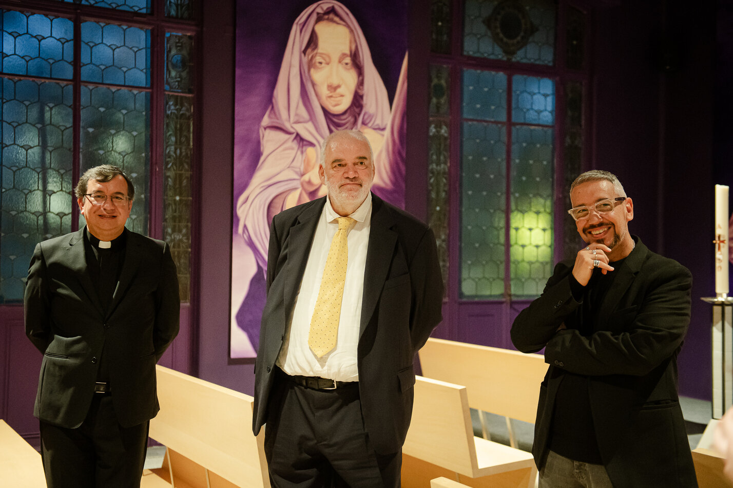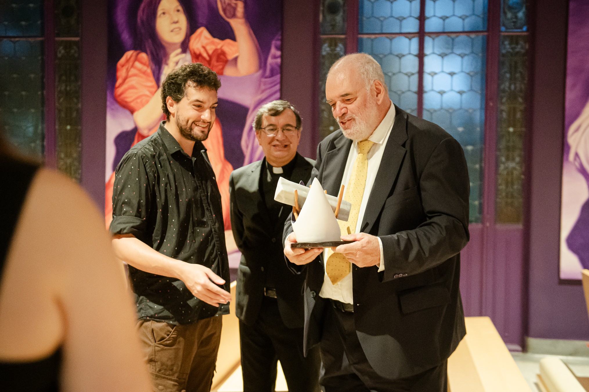 El artista fue recibido en la Capilla del Encuentro por el rector y por el director de la Licenciatura en Artes Visuales, que también es artista. Allí, alumni de la carrera le hicieron entrega de un obsequio muy especial, cargado de historia y sentido.